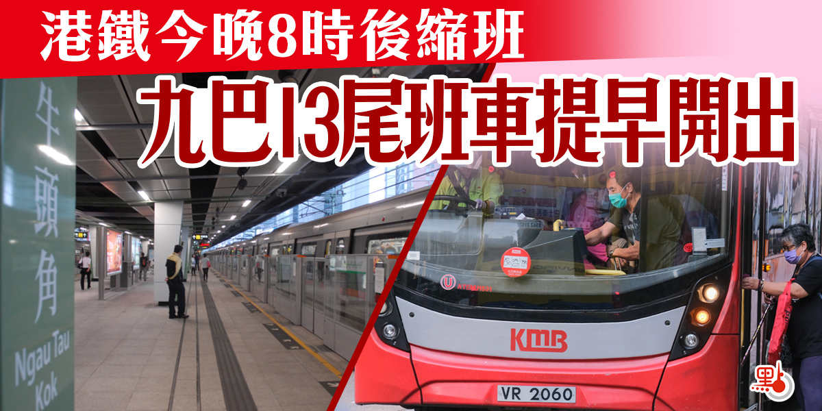 另外,九巴有13條巴士路線於今日起,尾班車時間改為晚上8時。路線包括47A、66M、67X、80M、82K、85B、88K、89B、234A、286M、290、296A、296M共13條,受影響的地區包括荃灣、屯門、沙田、深井、將軍澳等。