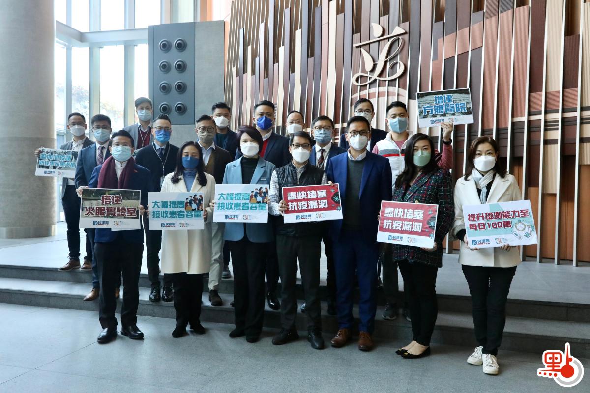 民建聯建議,港府應向中央請求,派遣疫情防控專家團來港,提供疫情防控意見和指導;增設最少3間火眼實驗室,安排1000名採樣和化驗人員透過輪班工作,為市民提供24小時的服務,將香港每日檢測量提升至100萬次,並推行非禁足式全民檢測,務求在7日內完成一輪全民強檢,配合精準圍封措施,以盡快切斷病毒傳播鏈。民建聯亦建議,中央協助興建方艙醫院,並在大型醫院附近興建隔離設施,提升接收患者的能力,協助內地中成藥入港,幫助市民防疫。