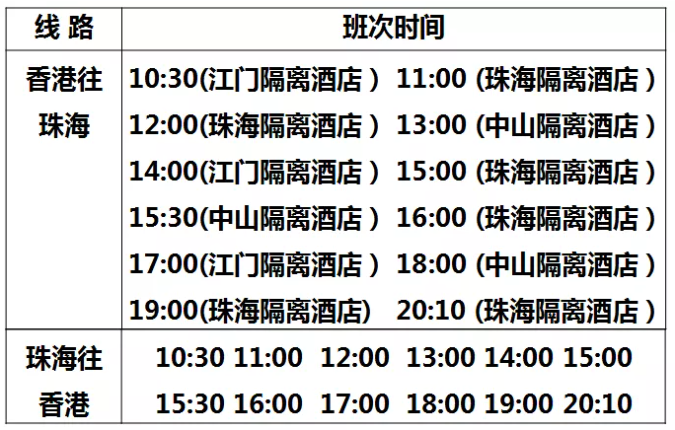 香港至珠海班次恢復服務後,每天共有12個班次,最早一班為上午10點半,最晚一點為晚上8點10分。每個班次的乘客會被分往江門、珠海、中山的隔離酒店(詳情見上圖)。