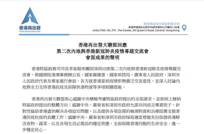香港再出發大聯盟表示,感謝中央、廣東省和深圳市政府對香港防疫抗疫工作的支援,包括允諾共同成立專責班子,針對性協助香港盡快解決各項迫切問題,提供各項急需的檢測物資和治療設備,以及保證供港鮮活食物、蔬菜、以及各項生活必需品的穩定供應。