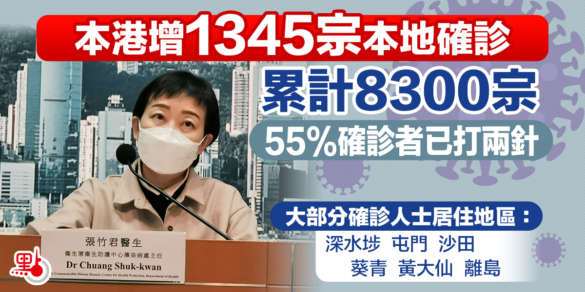 本港第五波疫情大爆發,確診數字連日倍數暴增。衞生署及醫院管理局今日(13日)下午舉行疫情記者會,衞生署衞生防護中心傳染病處主任張竹君公布,截至今日零時,本港新增1347宗確診個案,其中1345宗為本地個案,初步確診個案逾2000宗。過去累計約8300宗本地確診個案當中有55%已經接種兩針疫苗。