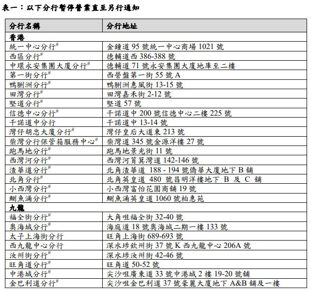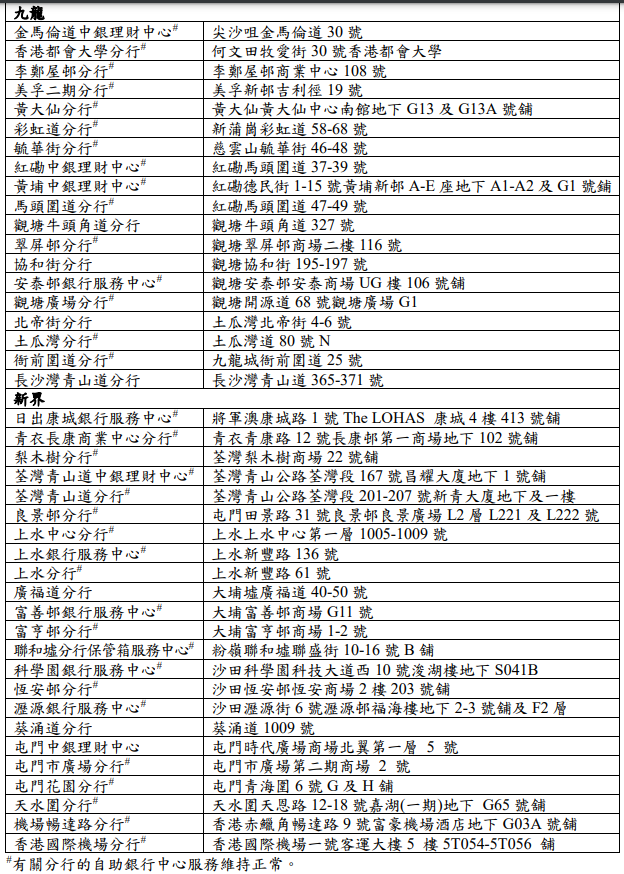 中國銀行(香港)昨日公布,有4名分行員工涉及初步確診新冠病毒,分別包括長沙灣道194號分行、又一城分行、中港城中銀理財中心,以及屯門新墟分行,今日(15日)起暫停營業,直至另行通知。截至昨日,中國銀行(香港)共有67間分行或理財中心暫停營業,相關分行的自助銀行中心服務維持正常。詳情請點擊查閱。
