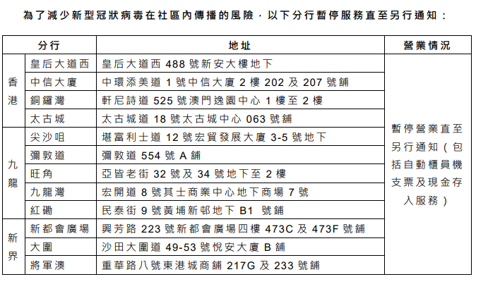 中信銀行(國際)昨日(14日)表示,彌頓道分行1名客戶經理及1名櫃台服務職員被列為新冠病毒病確診個案密切接觸者,彌敦道分行今日起暫停服務直至另行通知,該分行昨晚已經完成深層清潔及消毒,全部員工已獲安排接受檢測及於重返工作崗位前進行自我隔離。截至昨日,中信銀行(國際)共有12間分行暫停營業。詳情請點擊查閱。