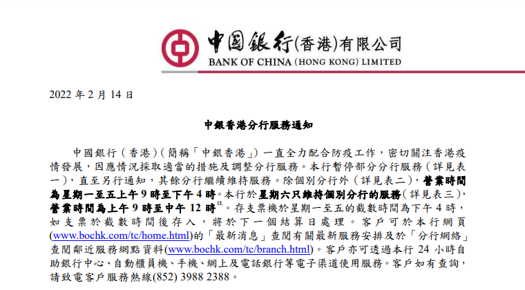 本港第五波疫情大爆發,多間銀行因員工確診而暫時關閉分行進行消毒清潔。中信銀行(國際)及中國銀行(香港)分別有職員確診或被列為密切接觸者而暫停相關分行服務。