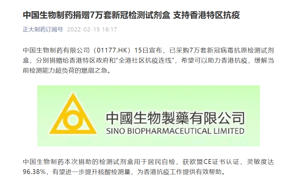 中國生物製藥本次捐助的檢測試劑盒用於居民自檢,獲歐盟CE證書認證,靈敏度達96.38%,有望進一步提升核酸檢測量,為香港抗疫工作提供有效幫助。
