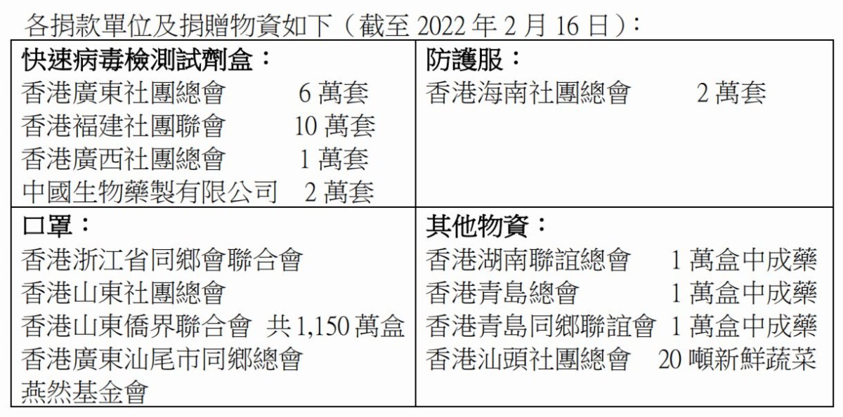 玉湖集團及香港賽馬會分別向「全港社區抗疫連線」捐贈500萬港元及1000萬港元,用作購買防疫物資,此外,「全港社區抗疫連線」亦已收到熱心機構捐出十萬份快速測試劑,其他物資亦不斷募集中。