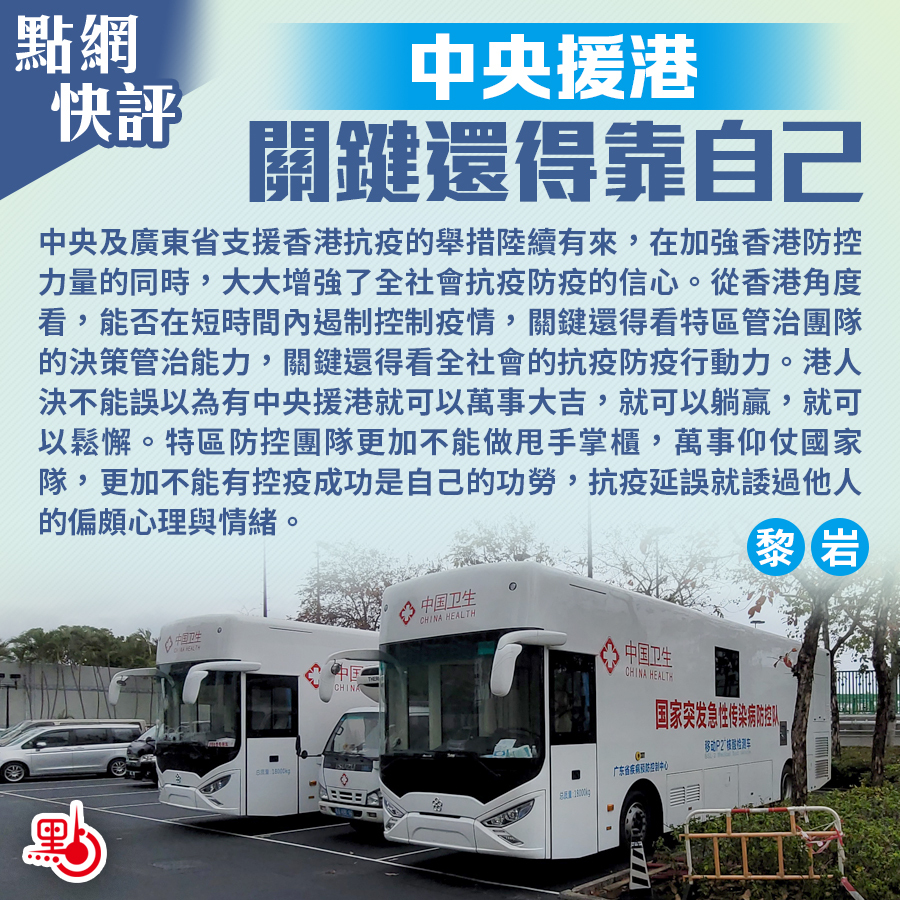 中央及廣東省支援香港抗疫的舉措陸續有來,在加強香港防控力量的同時,大大增強了全社會抗疫防疫的信心。從香港角度看,香港能否在短時間內遏制控制疫情,關鍵還得看特區管治團隊的決策管理能力,關鍵還得看全社會的抗疫防疫行動力,港人絕不能誤以為有中央援港就可以萬事大吉,就可以鬆懈,就可以躺贏。特區防控團隊更加不能做甩手掌櫃,萬事仰仗國家隊,更加不能有控疫成功是自己的功勞,抗疫延誤就諉過他人的偏頗心理與情緒。