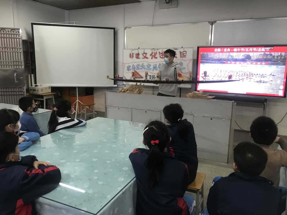 廣州「龍舟龍頭、龍尾製作」技藝非遺傳承人張偉潮18日來到黃埔區夏園小學,為學生講解中國的龍文化、龍舟習俗以及龍頭龍尾製作技藝。在北京冬奧會開幕式上,張偉潮製作的龍舟龍頭現身,讓中外觀眾感受中國傳統文化的精髓。據悉,廣州正在推動非遺文化進課堂,黃埔區全面在中小學開設非遺文化特色課程。