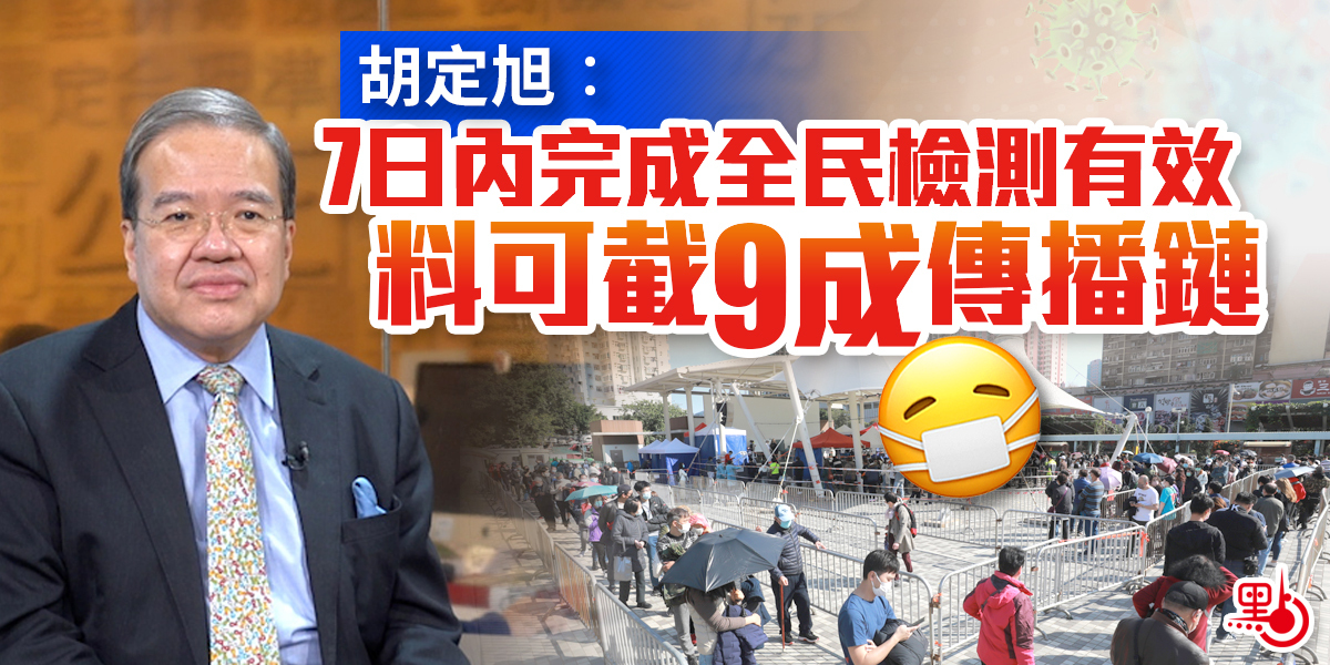 第五波疫情嚴峻,政府計劃推行全民檢測。全國政協常委、華昇診斷中心董事長胡定旭今日(20日)在電視節目中表示,相信在3至7日內完成檢測是有效,可找出並截斷社區9成傳播鏈。對於政府不計劃配合禁足令,他指,要考慮香港實際情況,因本港沒足夠配套為750萬市民送上食物、藥物等。