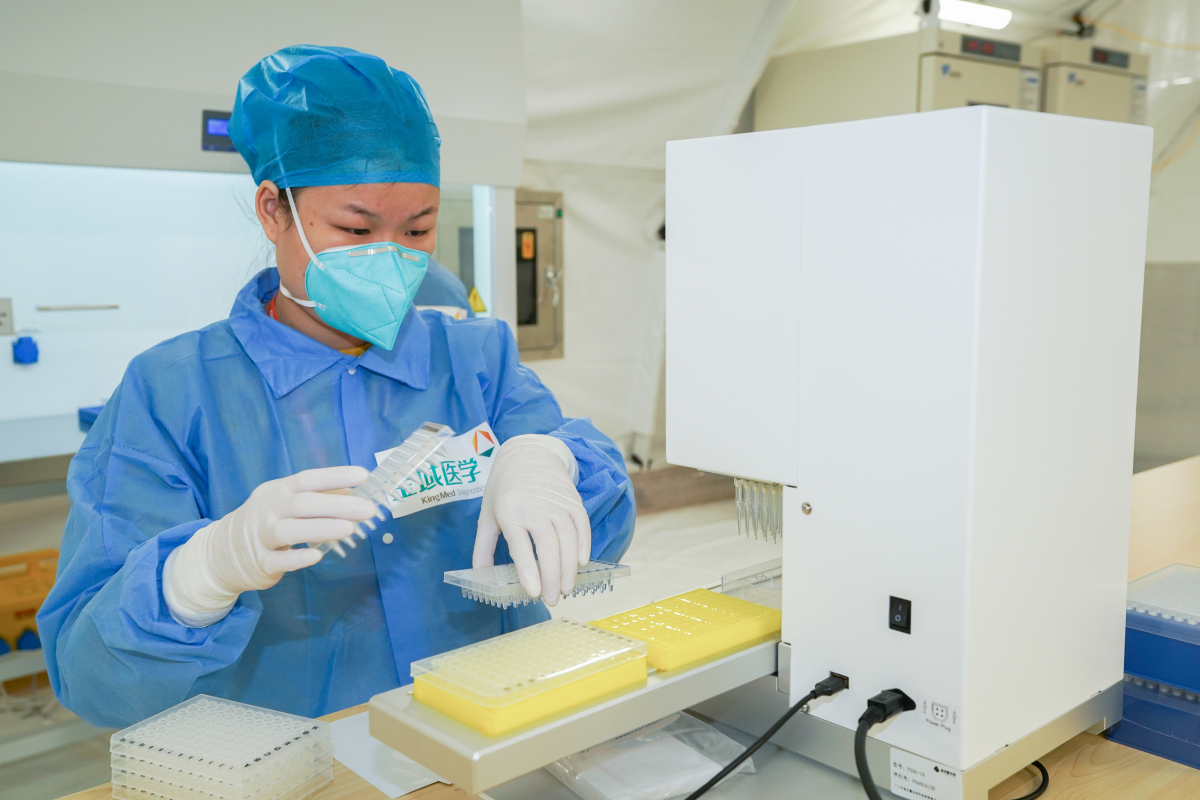 為全力支持香港盡快遏制疫情擴散,為特區政府在3月份推行全民強制核酸檢測作好準備,廣州金域醫學集團的1組五艙合一「獵鷹號」硬氣膜實驗室今日(25日)在九龍正式投入使用,這是目前通量最大、設備最先進的單組「獵鷹號」硬氣膜實驗室,日核酸檢測量可達8萬管。