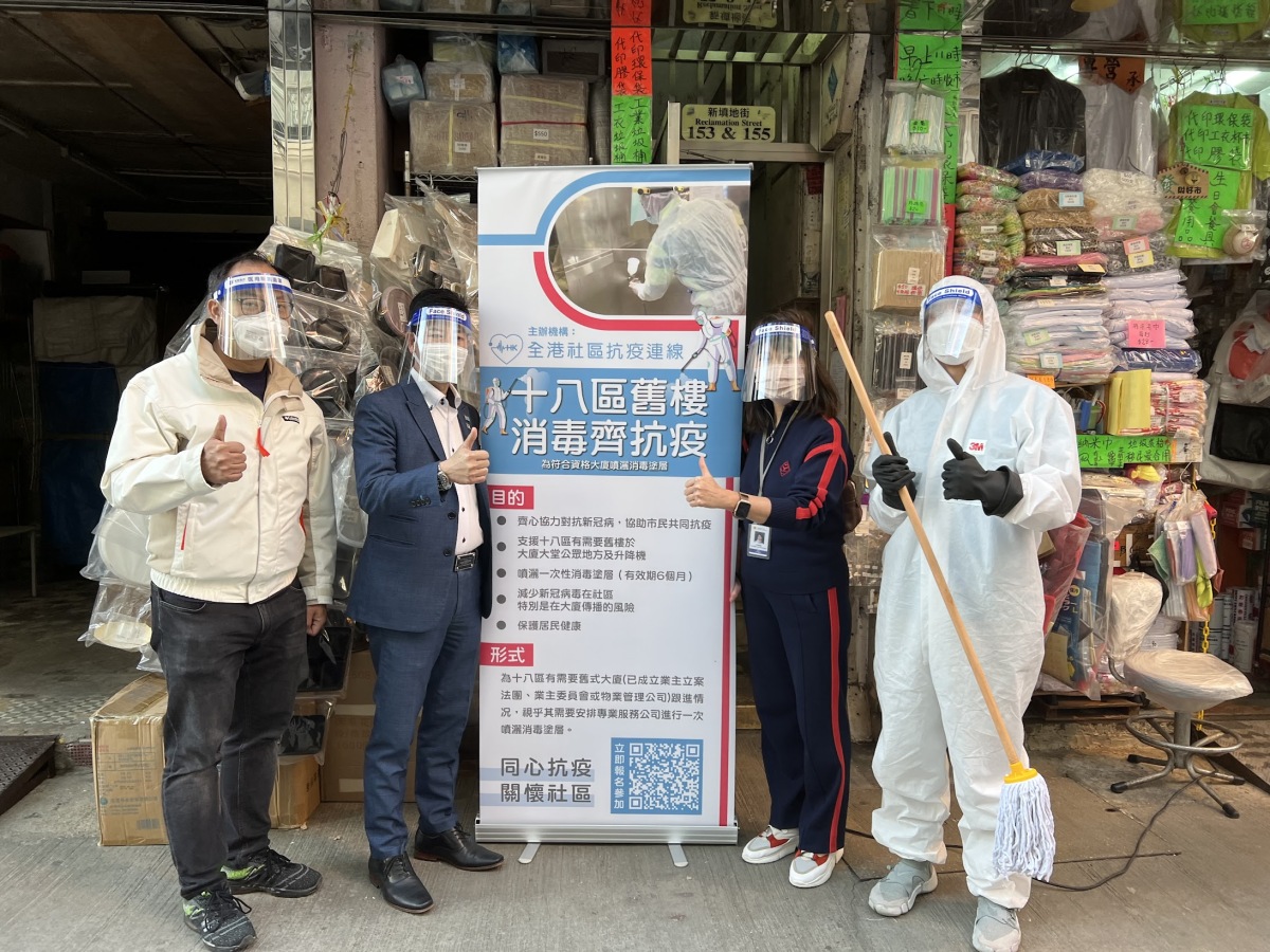 本周連線發起的「十八區舊樓消毒齊抗疫」計劃正是「同心抗疫關愛社區」系列行動中的重要一項。病毒四散,市民疫中苦捱,擔心「中招」,不安的情緒也似病毒在擴散蔓延。連線總召集人陳振彬向全港十八區地區領袖發出倡議,齊齊行動,為住在舊樓裏的社區居民,提供公共位置的一次性消毒及清潔服務。