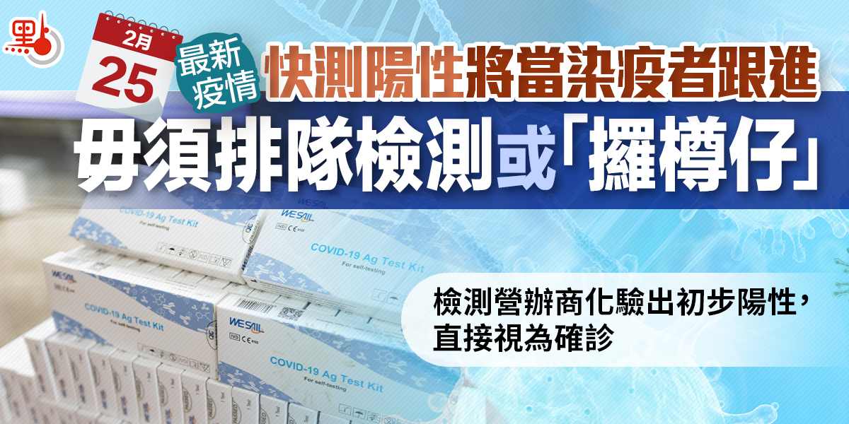 疫情浪接浪,確診數字再創新高,今日(25日)確診個案首破萬宗,另有逾2萬宗呈報個案。特區政府今日表示,快速測試呈陽性人士過往需要再提交樣本(如深喉唾液樣本等),進行核酸檢測以確認結果。為免耽誤時間、加快支援陽性個案人士,政府計劃容許快速測試呈陽性人士,透過網上系統直接登記陽性結果,而無須經過核酸檢測確認,便可被直接視為陽性個案跟進。相關安排及系統正在準備階段,詳情容後公布。