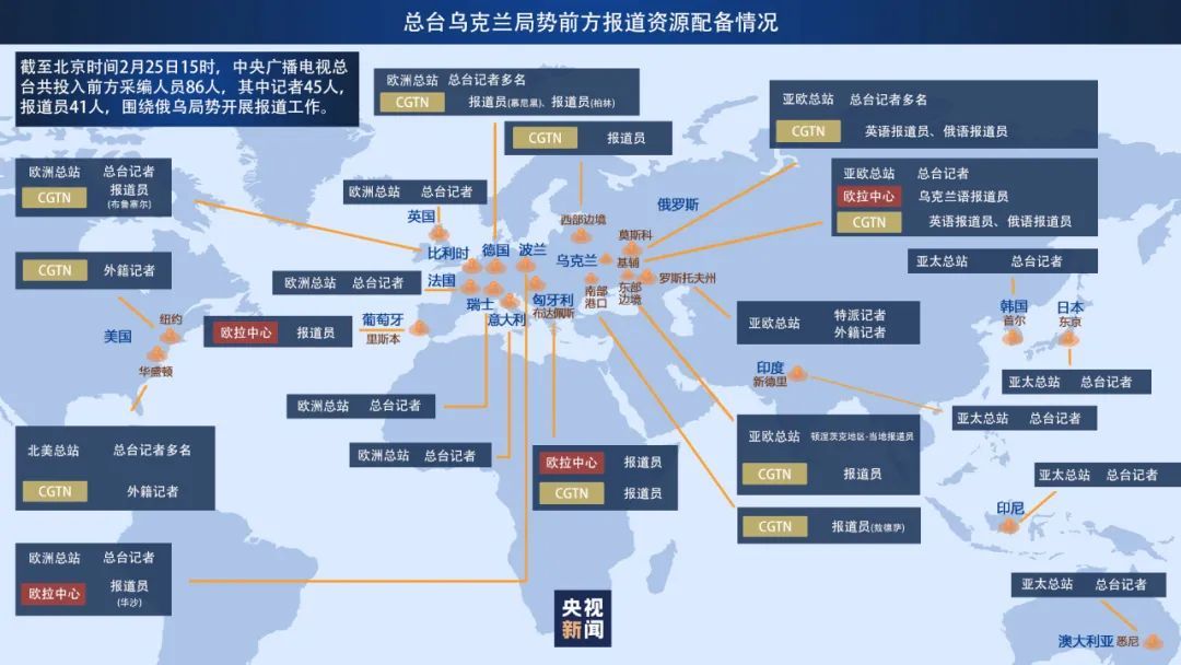 烏克蘭局勢發生突變後,中央廣播電視總台作為國際主流媒體,全力組織報道。截至北京時間25日15時,共投入前方報道人員86人,其中記者45人,報道員41人,圍繞俄烏局勢開展現場報道工作。
