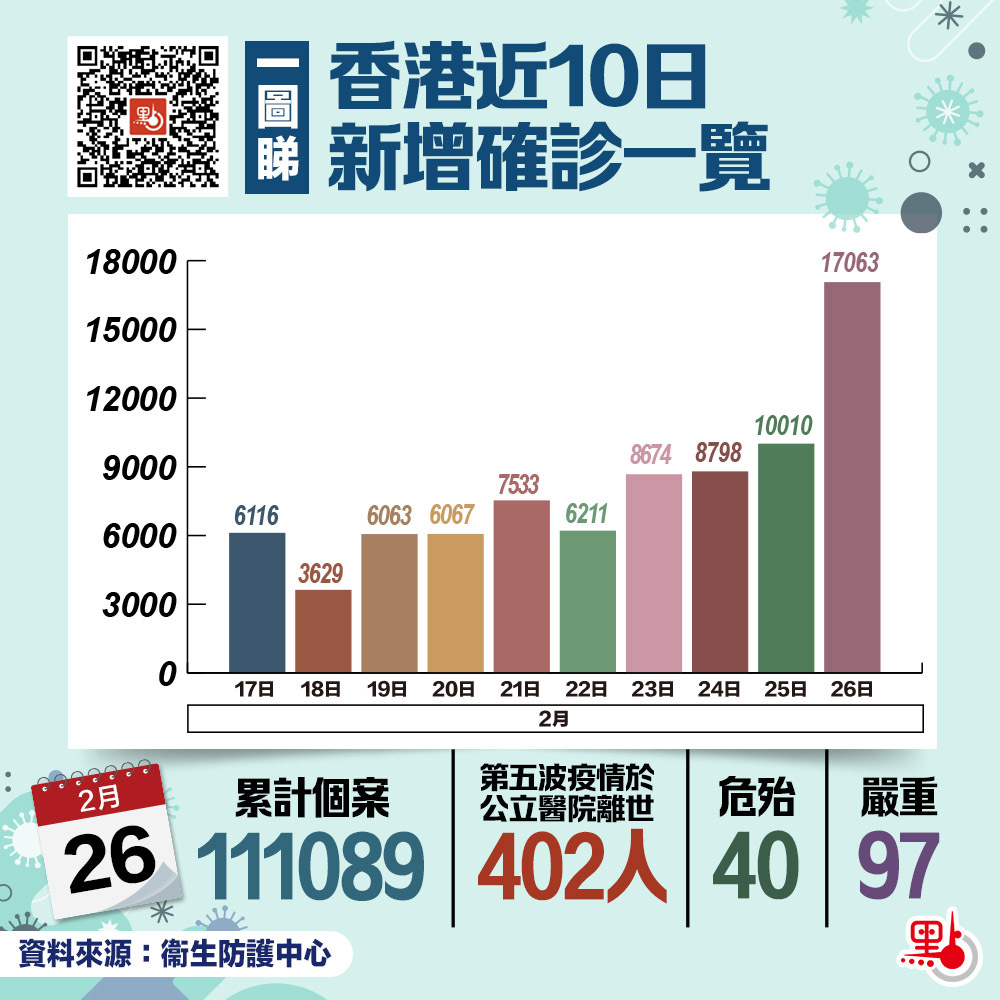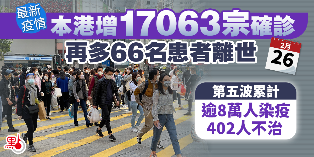 本港第五波疫情嚴峻,衞生署衞生防護中心總監徐樂堅今日(26日)在疫情記者會上公布,截至今日零時,本港新增17063宗呈報確診個案。