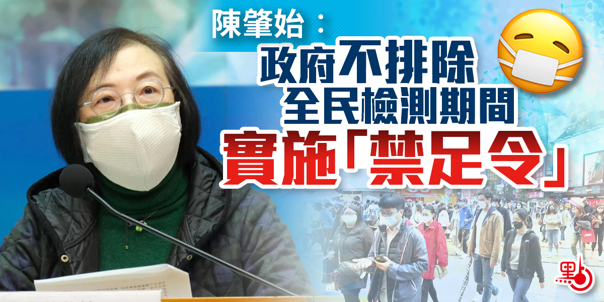 政府正計劃實行全民檢測,陳肇始對此強調檢測安排要發揮最好效用,就一定要減低人員流動,盡量減少市面人流,透露說政府目前並無完全排除在全民檢測期間實施「禁足令」。她認為,從公共衞生角度,全民檢測越快完成越好,當局會設法壓縮檢測時間,目前仍正馬不停蹄商討具體推行細節及時間等。此外,她亦表示,全民檢測安排會顧及行動不便人士,包括需要在安老院長期臥床的長者,可能會安排上門為他們進行核酸檢測。