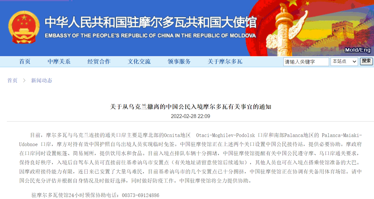 中國駐摩爾多瓦使館指,摩方會在連接烏克蘭的兩個口岸,為持有效護照的中國公民臨時免簽。使館會在兩個關口設置中國公民接待站,提供必要協助。摩爾多瓦政府同時設置帳篷、簡易廁所,提供飲用水和食品。