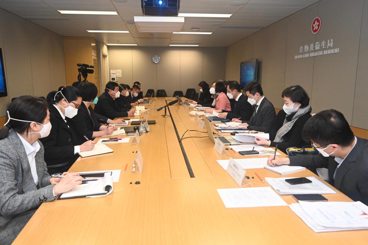 食物及衞生局長陳肇始今日(3月1日)聯同醫管局主席范鴻齡、總裁高拔陞等政府官員及政府專家顧問包括梁卓偉、袁國勇、許樹昌、劉澤星、劉宇隆和孔繁毅等與內地專家梁萬年、其專家團成員,以及內地流行病學專家工作小組成員在政府總部舉行會議,會議就本港疫情作深入交流,並討論第五波疫情面對的挑戰,以及內地應對疫情的經驗。