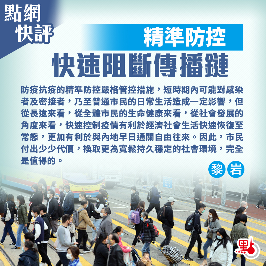 防疫抗疫的精準防控嚴格管控措施,短時期內可能對感染者及密接者,乃至普通市民的日常生活造成一定影響,但從長遠來看,從全體市民的生命健康來看,從社會發展的角度來看,快速控制疫情有利於經濟社會生活快速恢復至常態,更加有利於與內地早日通關自由往來。因此,市民付出少少代價,換取更為寬鬆持久穩定的社會環境,完全是值得的。
