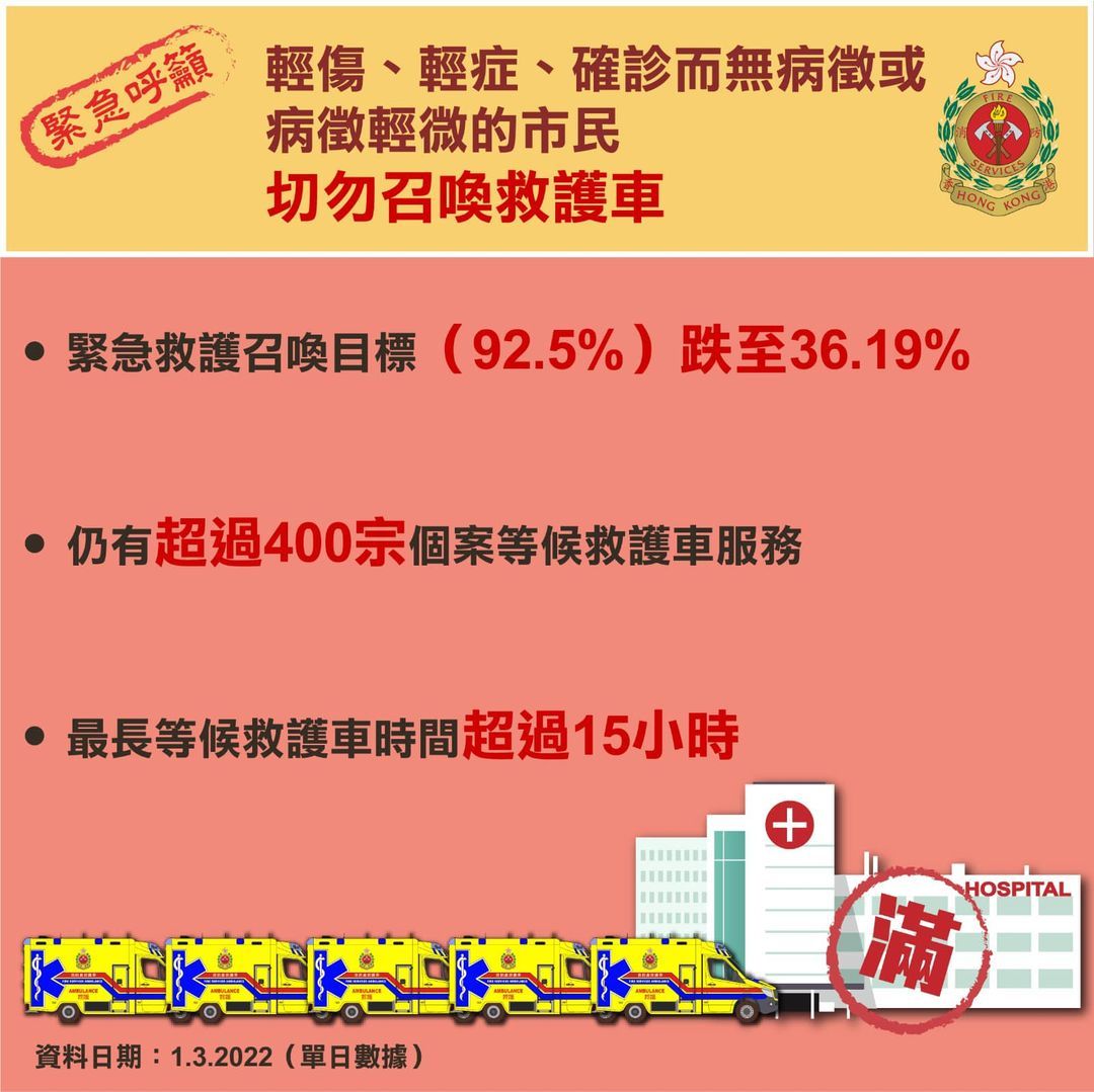 本港第五波疫情嚴峻,救護資源不勝負荷。消防處今日(2日)在社交平台發文表示,昨日(1日)消防處緊急救護召喚目標由92.5%跌至36.19%。有超過400宗個案等候救護車送院,其中最長等候時間超過15小時。