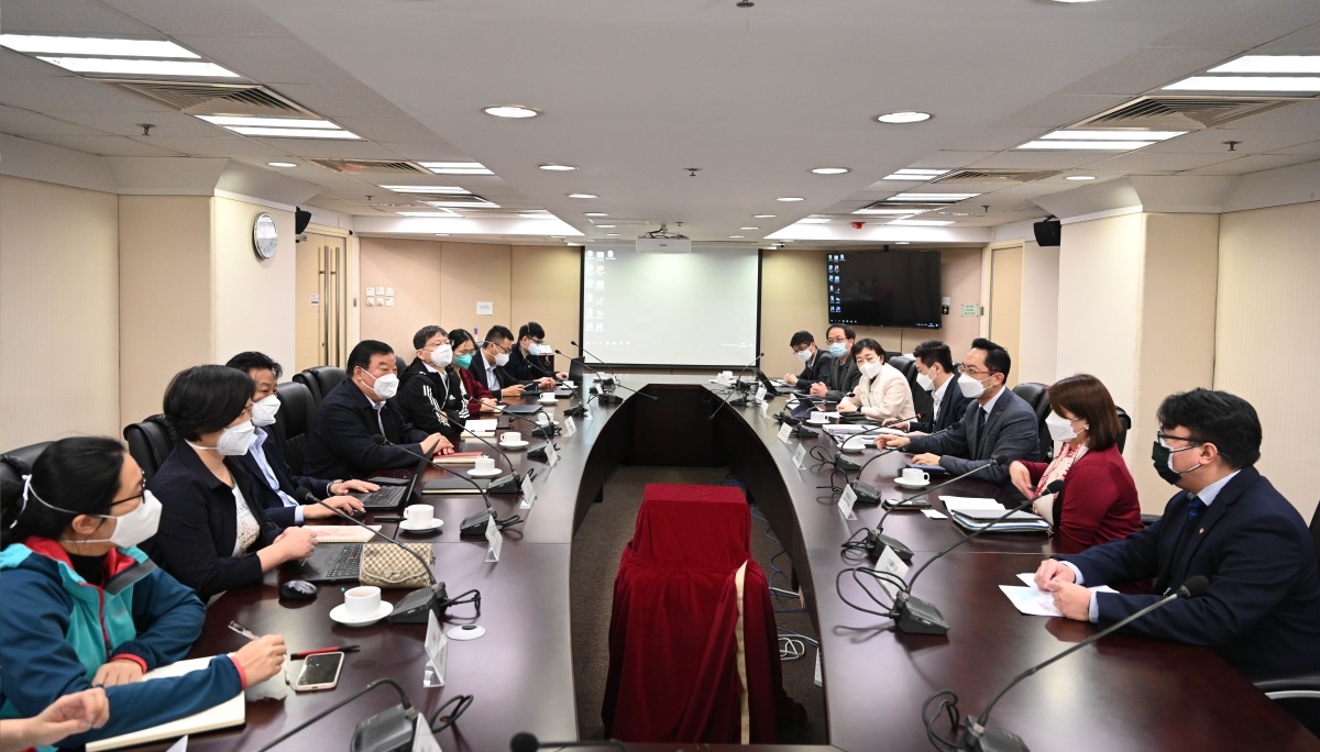衞生署署長林文健醫生、衞生署衞生防護中心總監徐樂堅和相關衞生署同事及醫管局代表,今早與梁萬年、其專家團成員,以及內地流行病學專家工作小組成員在衞生防護中心舉行會議。雙方就本港疫情作深入交流和就相關數據作分析,並討論第五波疫情面對的挑戰,以及內地應對疫情的經驗。