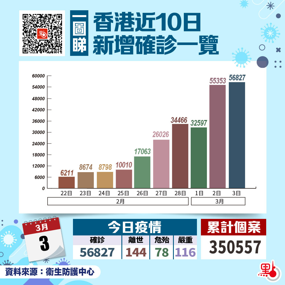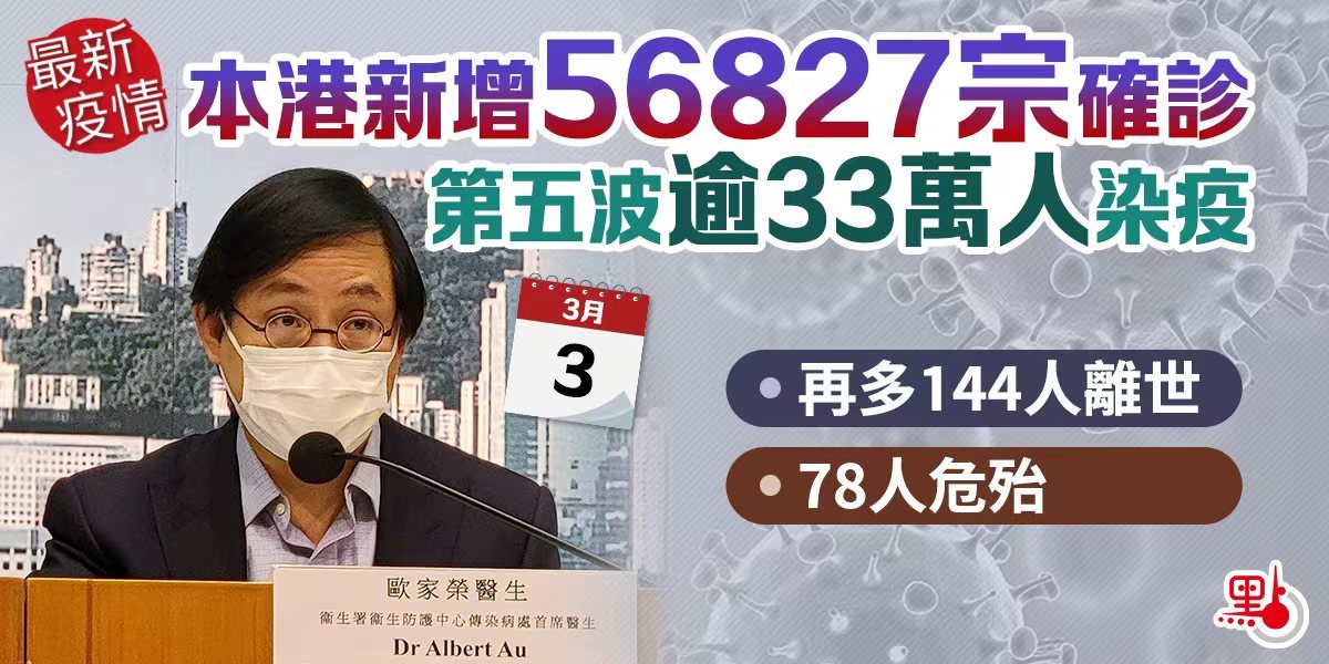本港第五波疫情嚴峻,衞生署及醫管局今日(3日)下午舉行疫情記者會。衞生防護中心傳染病處首席醫生歐家榮公布,截至今日零時,本港新增56827宗確診個案,其中2宗為輸入個案,56825宗為本地個案。第五波疫情累計已經有超過33萬宗確診。兩年多疫情以來,本港已累計350557人染疫。