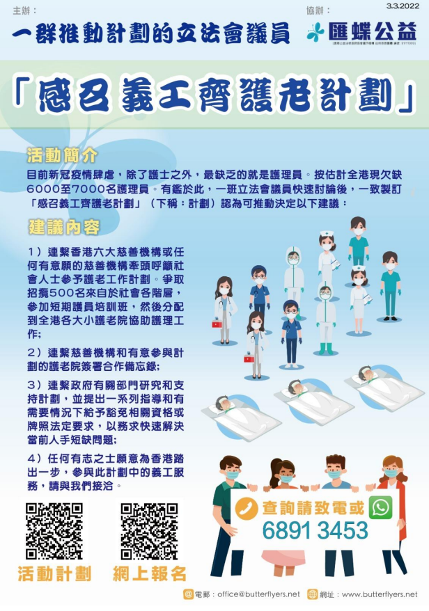 本港新冠肺炎疫情持續嚴峻,安老院舍成為重災區,嚴重缺乏人手。立法會議員何君堯、梁美芬、狄志遠等19名議員今日(3日)發起「感召義工齊護老計劃」,爭取招攬500名市民參加短期護員培訓班,分配到安老院舍協助相關護理工作。