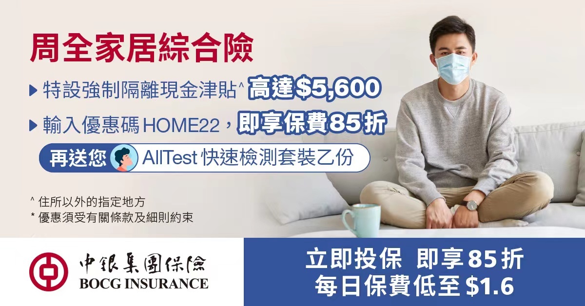 本港新冠疫情肆虐,為支持市民抗擊疫情,配合現時防疫政策,中銀集團保險第一時間針對家居險推出「傳染病隔離現金津貼」保障,並推出推廣活動。凡持有中銀集團保險家居險客戶,即時免費升級保障範圍,額外延伸「傳染病隔離現金津貼」保障,若受保人及/或其家人因傳染病事故收到香港政府通知,需在住所以外的指定地方接受強制隔離,可獲得每個完整及連續24小時的現金津貼。