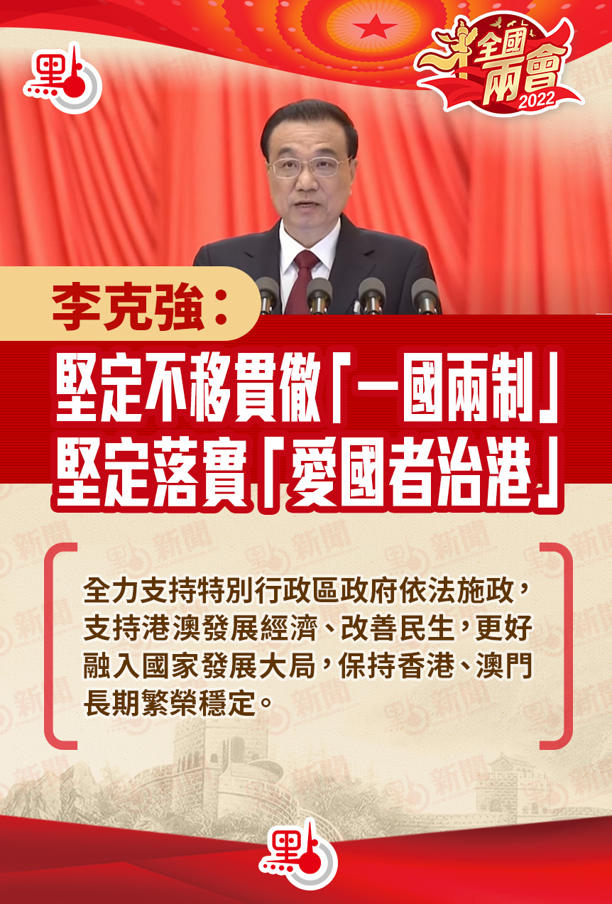 李克強表示,要繼續全面準確、堅定不移貫徹「一國兩制」、「港人治港」、「澳人治澳」、高度自治的方針,落實中央對特別行政區全面管治權,堅定落實「愛國者治港」、「愛國者治澳」,全力支持特別行政區政府依法施政,支持港澳發展經濟、改善民生,更好融入國家發展大局,保持香港、澳門長期繁榮穩定。