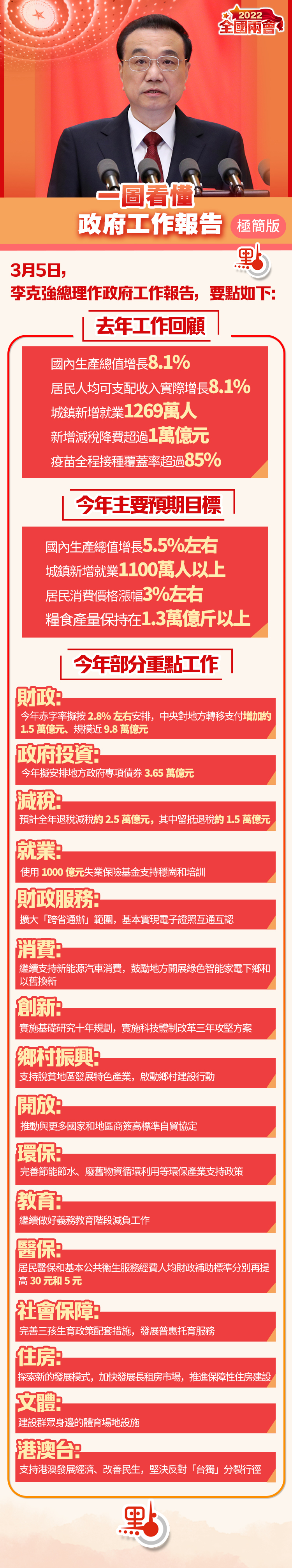 十三屆全國人大五次會議開幕會今日(5日)早上9時在北京人民大會堂舉行,國務院總理李克強代表國務院向十三屆全國人大五次會議作政府工作報告。點新聞整理報告的去年工作回顧、今年主要預期目標、今年部分重點工作等,製作成一圖,方便讀者掌握要點。