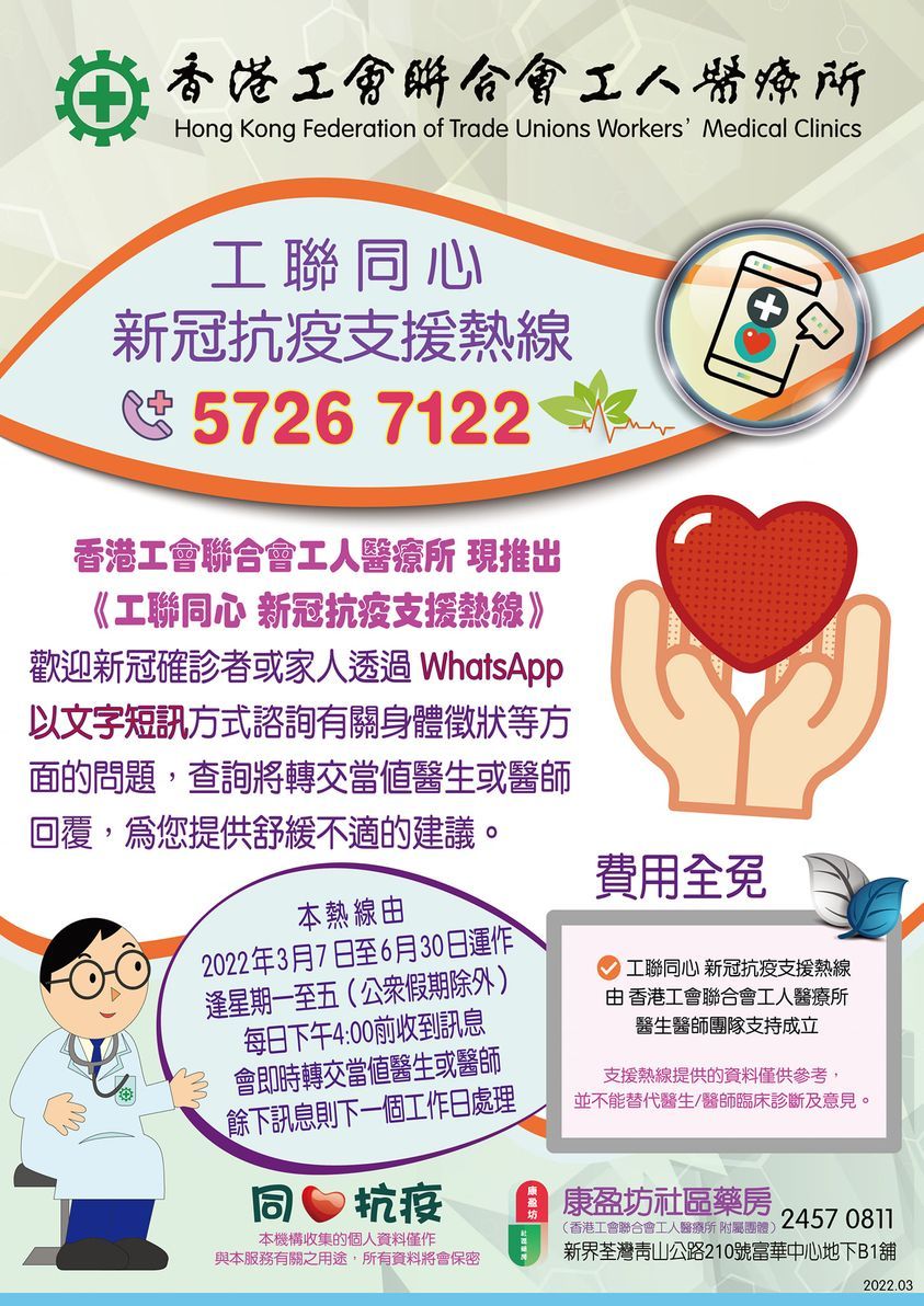 本港疫情嚴峻,市民求診需求急增。工聯會今日(5日)宣布,將推出醫生抗疫諮詢熱線,歡迎新冠確診者或其家人透過WhatsApp以文字短訊方式諮詢有關身體徵狀等方面的問題,有關查詢將轉交當值專業醫生或中醫師回覆,為市民提供一些舒緩不適的建議,費用全免。