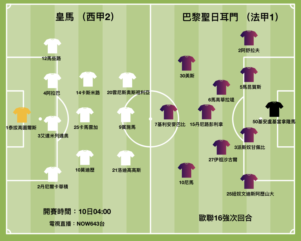 西甲勁旅皇家馬德里力求在歐聯16強次回合,藉主場之利和首席射手賓施馬回勇,逆轉首回合落後0:1的劣勢。可惜他們受到主力缺陣影響,加上聖日耳門有備而來,皇馬要逆轉晉級是談何容易。(香港時間周四凌晨4時開賽,NOW643台直播)