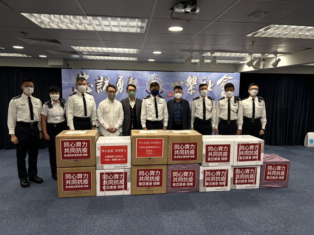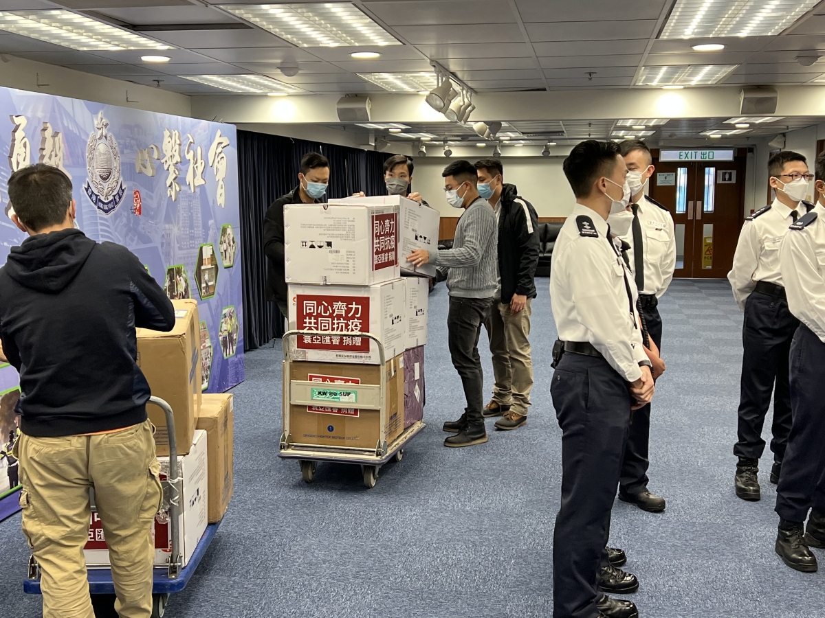 本港疫情持續嚴峻,日前有消息指警隊有一成人手因確診新冠病毒或須隔離而缺勤,社會各界人士紛紛伸出援手,用實際行動支持警隊。今日(9日)寧夏港區政協委員、寰亞匯睿主席閻偉寧,寰亞匯睿副會長陸紀仁,香港居民黃照輝,香港羅馬集團主席余季華和美羅國際生物科技(香港)有限公司的代表等一行,攜帶大批新冠檢測套裝和連花清瘟膠囊等抗疫物資前往香港警察西九龍總區進行捐贈慰問。警察西九龍總區署理指揮官何潤勝總警司,西九龍總區(行動)黃志威高級警司,西九龍總區機動部隊黎皓暉警司,西九龍總區機動部隊葉振忠總督察,西九龍總區衝鋒隊孔泳雯高級督察等在場接收有關物資。