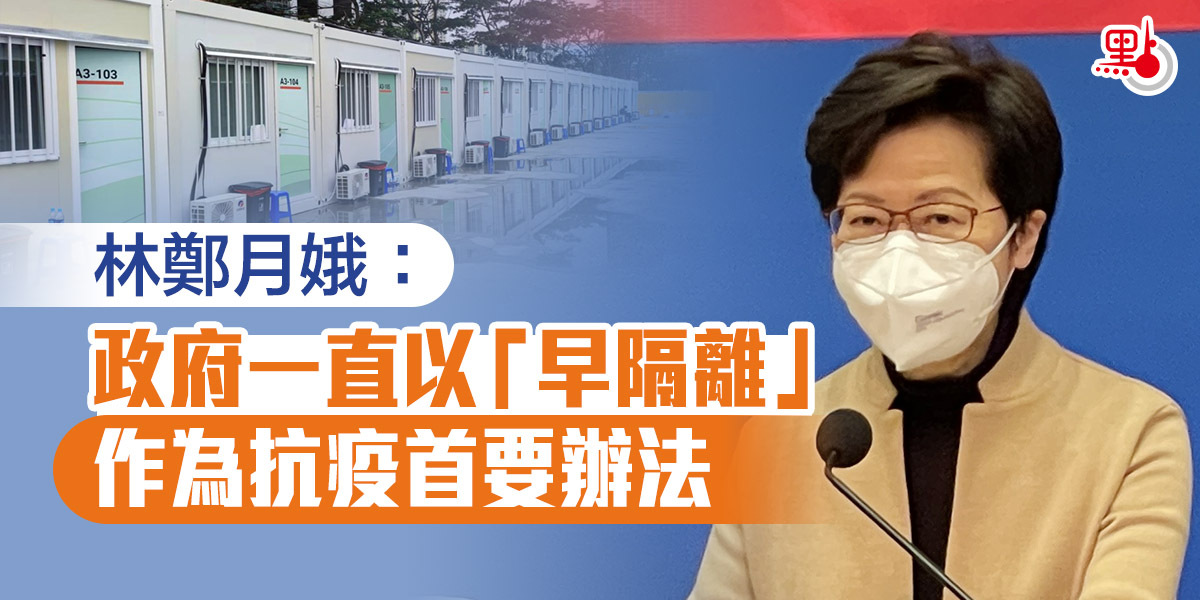 行政長官林鄭月娥今日(10日)連同保安局局長及發展局局長出席每日政府高層新聞發布會,交代由中央援建社區隔離設施的事宜。其中,林鄭月娥介紹,特區政府一直以「早隔離」作為抗疫首要辦法。