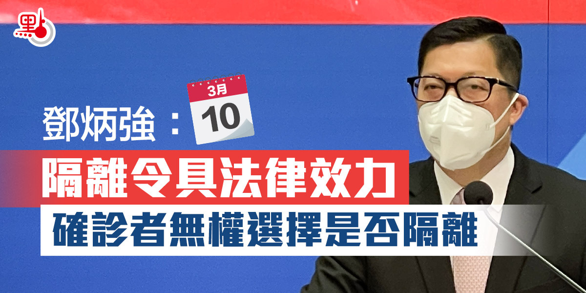 本港第五波疫情嚴峻,行政長官林鄭月娥今日(10日)上午繼續舉行記者會,交代抗疫最新情況。保安局局長鄧炳強在記者會上表示,當衞生署發出隔離令後,要求確診者入住隔離設施的時候,隔離令具有法律效力,確診者應根據指示入住隔離設施,沒有權力選擇是否進入隔離設施,否則是違法行為。