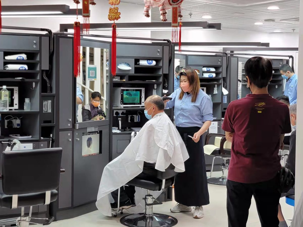 隨後點新聞記者到商場內的專門理髮店,店內除了提供剪髮,亦有洗頭、電髮及焗油美髮服務,記者發現店內等候的人數比較少,有顧客張小姐表示,知道今天不少理髮店都大排長龍,她選擇專門的理髮店,因為這類店舖收費比較高,人流較少而且可預約,不用等候太多時間。