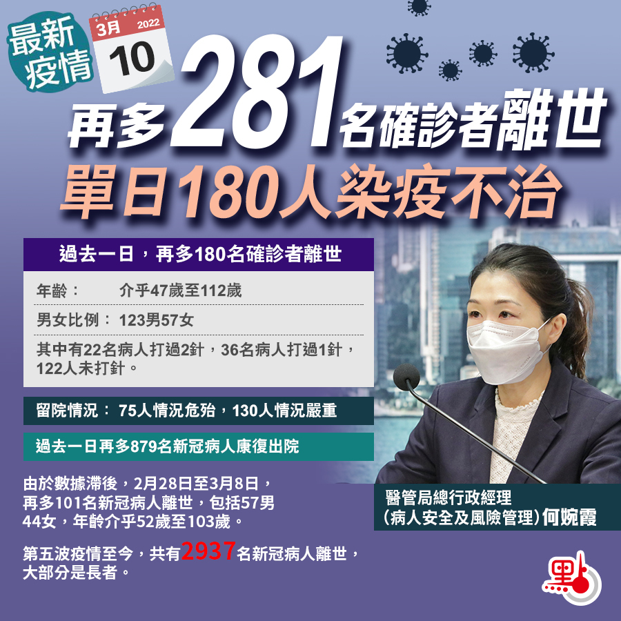 本港第五波疫情嚴峻,今日(10日)共新增31402宗確診個案,其中包括24390宗核酸檢測確診個案,7012宗快測陽性呈報有效個案。醫管局總行政經理(病人安全及風險管理)何婉霞今日在疫情記者會上公布,再多281名確診者離世,當中過去一日再多180名確診者離世;由於數據滯後,2月28日至3月8日,再多101名新冠病人離世,包括57男44女,年齡介乎52歲至103歲。