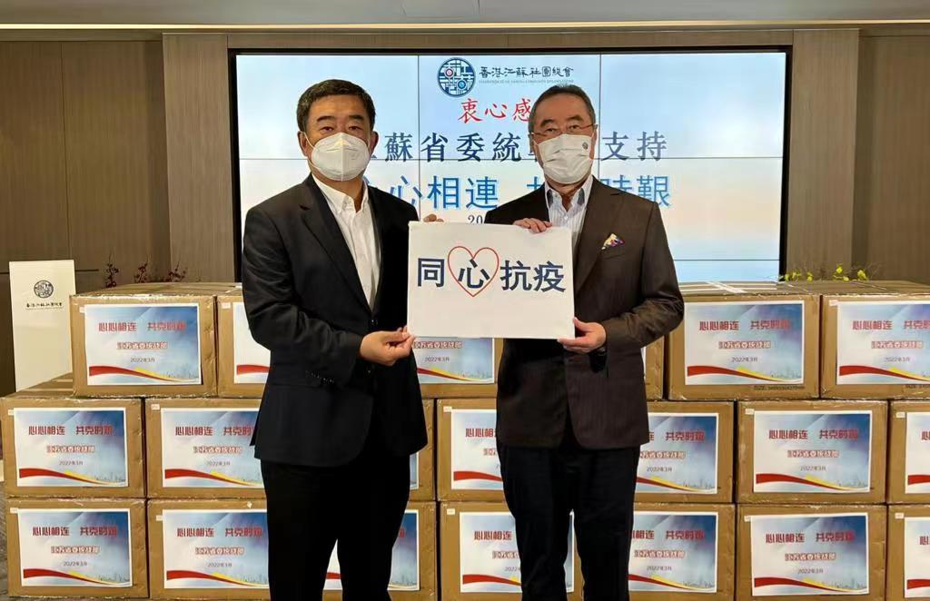 香港江蘇社團總會會長唐英年今日(10日)代表香港江蘇社團總會,接收江蘇省委統戰部捐贈的抗疫物資,包括4萬支新冠病毒快速檢測試劑盒和10萬個KN95口罩。唐英年表示,會馬上將物資分派給會員鄉親義工及有需要的市民。