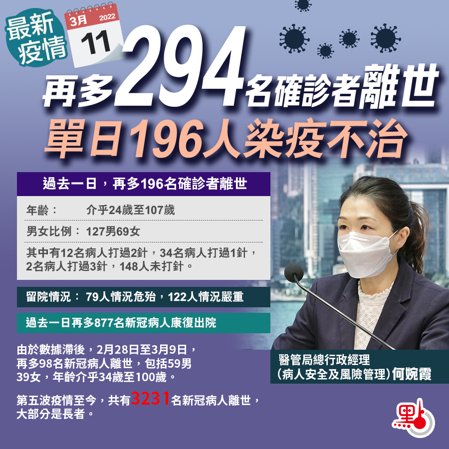 本港第五波疫情嚴峻,今日(11日)共新增29381宗確診個案,其中包括18888宗核酸檢測確診個案,10493宗快測陽性呈報有效個案。醫管局總行政經理(病人安全及風險管理)何婉霞今日在疫情記者會上公布,再多294名確診者離世,當中過去一日再多196名確診者離世;由於數據滯後,2月28日至3月9日,再多98名新冠病人離世,包括59男39女,年齡介乎34歲至100歲。