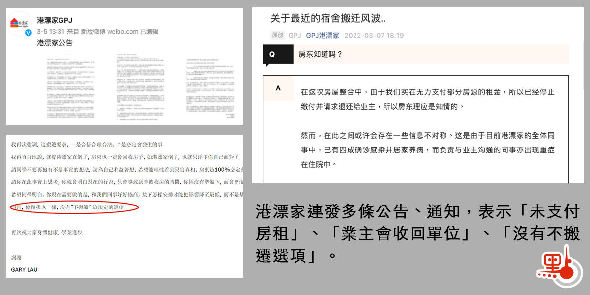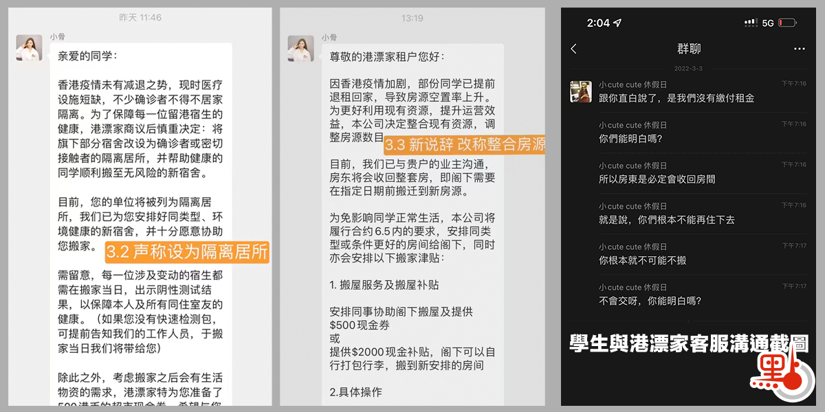 「港漂家讓學生搬家,把同學混租到各個大樓,有些大樓還是有確診病例的,有的學生被通知從黃埔搬到深水埗。」小Y說。面對這一幾乎沒有任何商量餘地的搬家通知,學生租客們備感不安:當下香港每天新增確診過萬例,為何要我們冒染疫風險突然搬家?有學生租客向客服提出質問,其中一位名為「小cute cute」的客服回應態度惡劣,更明言港漂家已經停止向房東支付租金,「房東必定會收回房子,你們根本不可能再住下去,不可能不搬。」