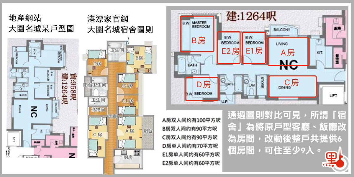 有業主遇欠租及單位被分租,入稟收回單位。在一份學生租客曾收到的《致實際管有或居住者通知書》上,記者留意到,該單位為大圍豪宅名城。通過對比港漂家官方宣傳的「大圍名城宿舍圖則類型1」與在本港地產網站查到的名城原始圖則可以看到,該「宿舍」將原客廳、飯廳改為兩個雙人床房間,公共空間只剩廚房、衞生間及一條聯通所有房間的走廊。改動後整套房共有6個房間,可容納9人。