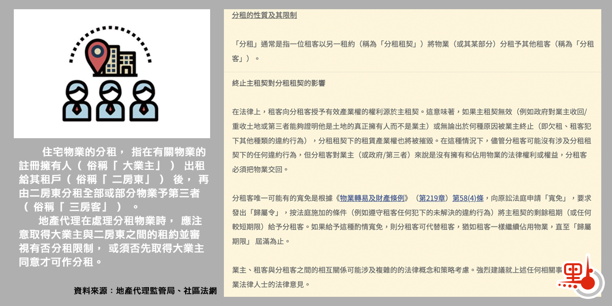 記者查詢有關法律意見後得知,住宅物業的分租,指在有關物業的註冊擁有人(俗稱大業主)出租給其租戶(俗稱二房東)後,再由二房東分租全部或部分物業予第三者(俗稱三房客)。單位是否可以分組,視乎大業主與二房東的租約(主租契)而定,若列明不可分租,二房東租給別人則是違法;如果沒有分租限制,或須先取得大業主同意才可作分租。若二房東隱瞞主租契條款分租房間給三房客並簽分租契約,相關租約亦屬無效。在此情況下,即便三房客沒有任何違約行為,也會面臨遭大業主驅趕的可能。