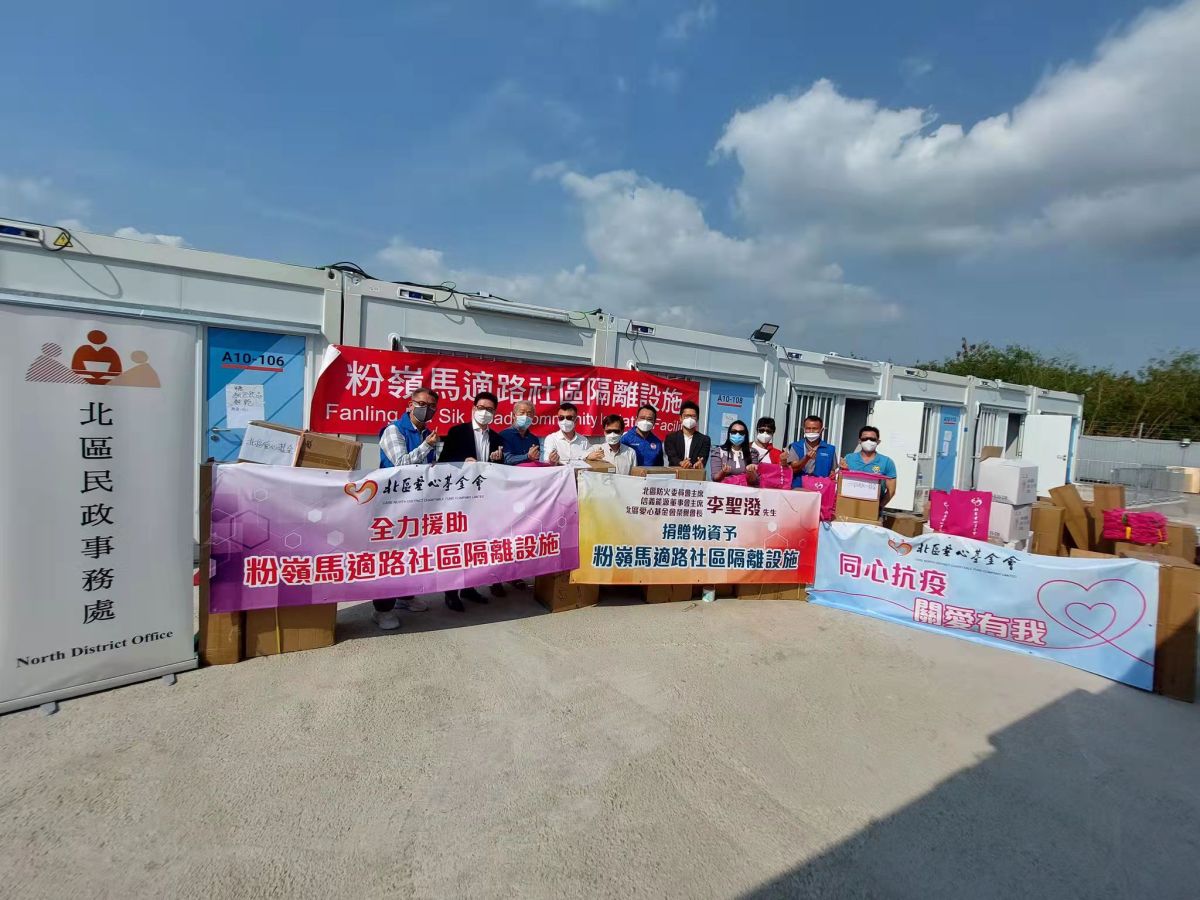 由中央援建的粉嶺馬適路社區隔離設施已於3月13日交付特區政府使用,在北區民政事務專員莊永桓的帶領下,北區愛心基金會榮譽會長、北區防火委員會主席和信義能源董事會主席李聖潑捐款北區愛心基金會購買30萬元物資,並於今日(14日)贈送予馬適路隔離設施內的隔離人士。