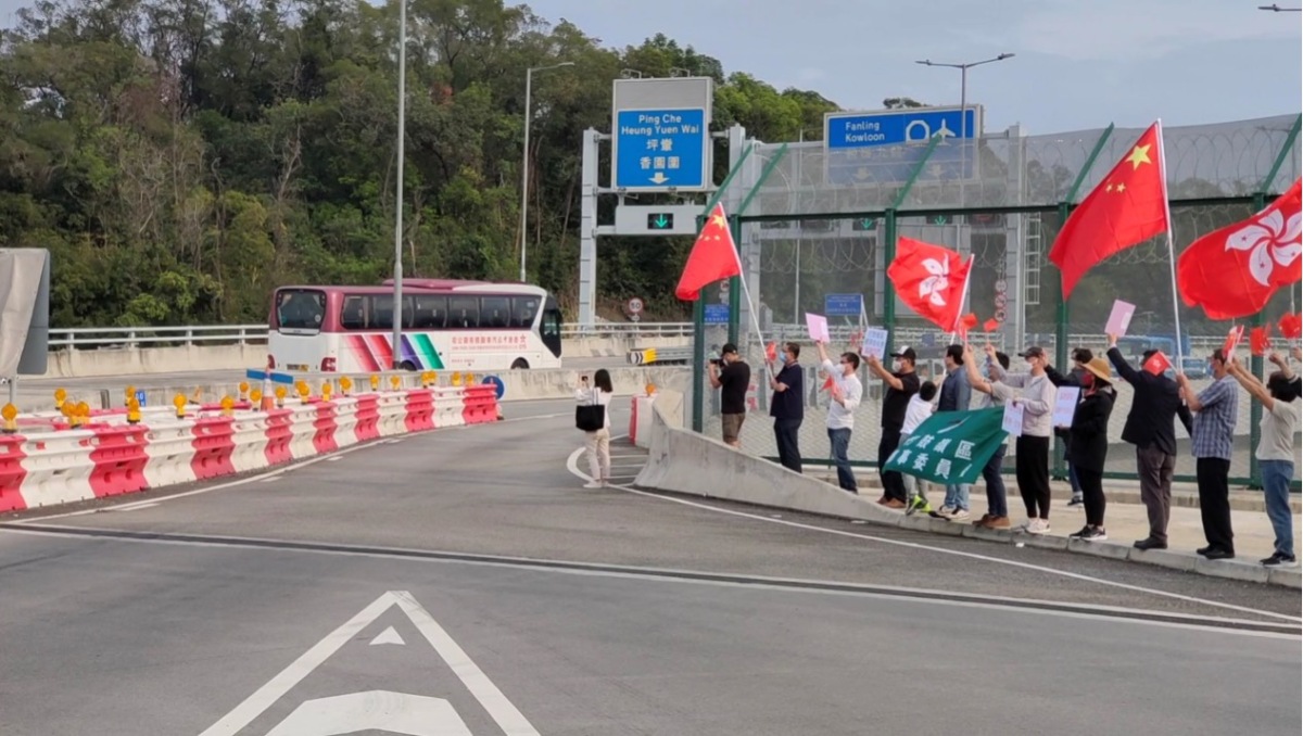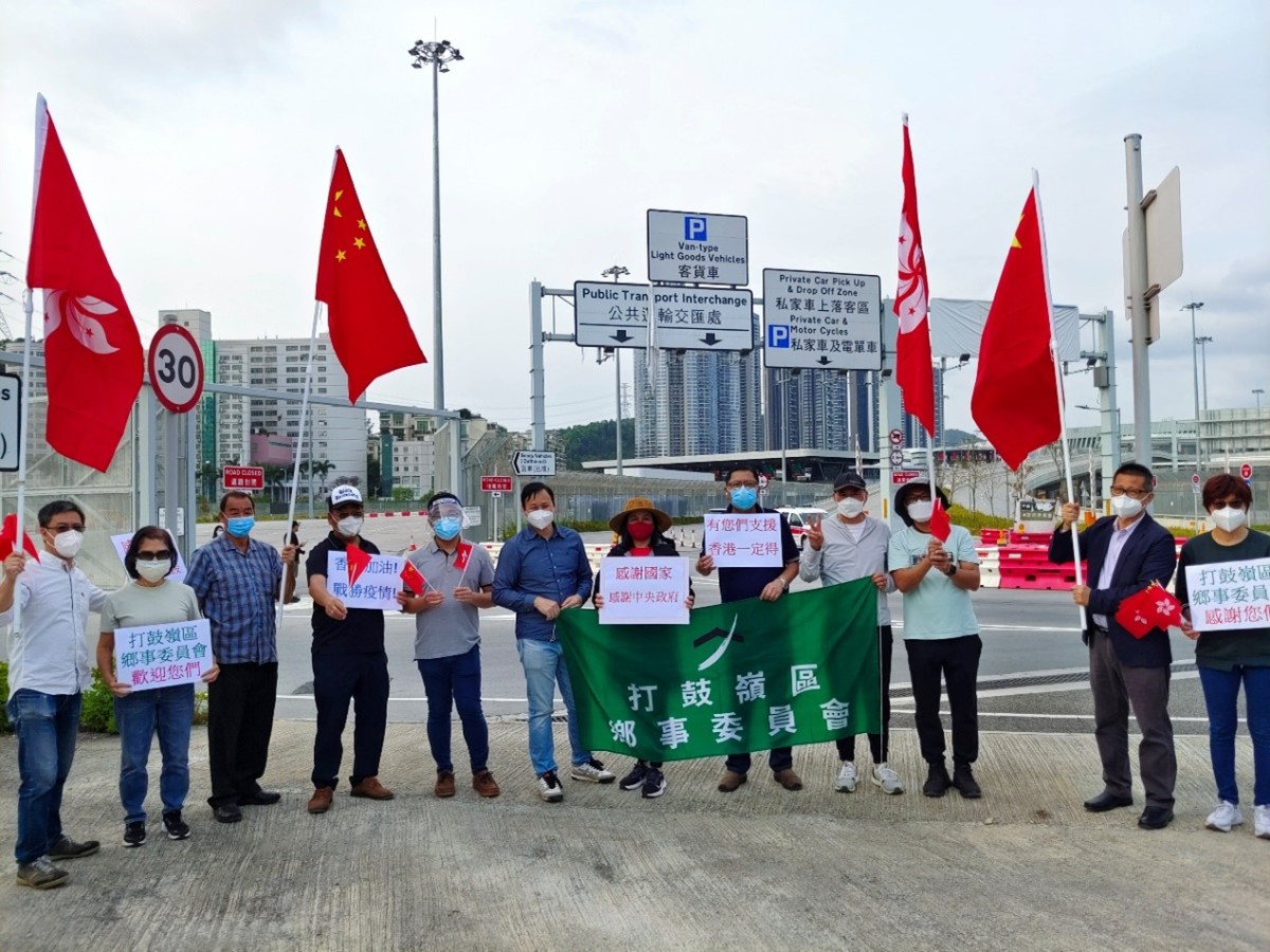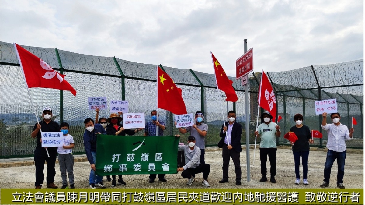 打鼓嶺區居民自發組織在香園圍口岸外圍夾道歡迎,立法會議員、打鼓嶺區鄉事會主席陳月明,打鼓嶺區鄉事會副主席林金貴及陳富鵬,新社聯北區地委會主席溫和輝,北區區議員高維基,打鼓嶺坪輋居民協會會長鄭福明、秘書長李豪,村代表萬慶新、易嘉文、萬新才及多位鄉親,手持國旗、區旗、橫幅等,對抵港的內地援港團隊表示熱烈歡迎,並不斷齊聲高呼「感謝國家、感謝中央政府、感謝內地同胞、有您們支援、香港一定得」等歡迎口號,言之懇切,心之真誠。