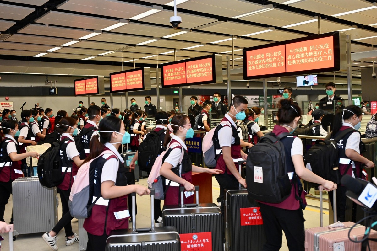 今日(16日)下午2時半,應香港特區政府請求,由廣東省組派的內地援港醫療隊300人抵港,將全力配合特區政府開展病人救治工作,幫助香港盡快穩控疫情。行政長官林鄭月娥到香園圍口岸迎接,並代表特區政府和所有香港居民對內地醫護來港支援表示衷心感謝。