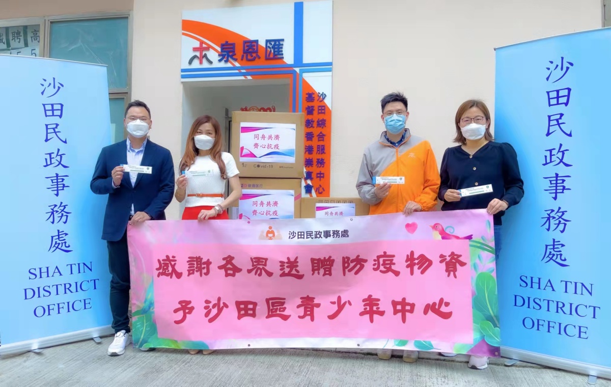 為全力支持香港同心抗疫,沙田民政事務處聯同沙田區青年活動委員會主席王槐裕以及沙田社區抗疫連線,今日(17日)於沙田圓洲角社區會堂舉行啟動禮,向區內16間綜合青少年服務中心和兒童及青年中心(中心),捐贈快速抗原測試套裝、保護衣及口罩等抗疫物資,幫助區內有需要人士及中心工作人員,與市民同心抗疫。