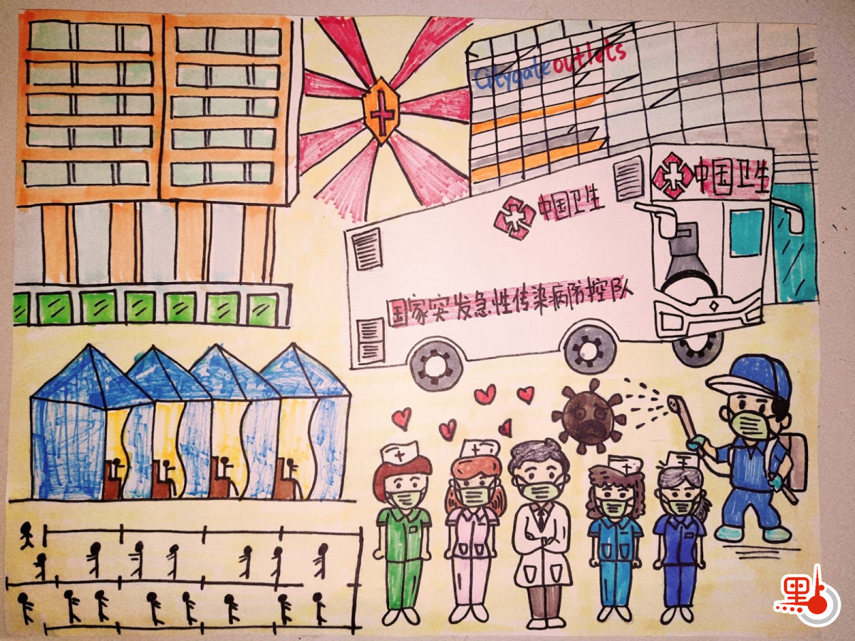 我畫這幅畫的目的,主要是希望疫情快點過去,大家能快點過回正常的生活。也要感謝醫護人員每日的努力工作,感謝他們的努力,謝謝他們傾盡全力抗擊疫情,我們也會做好措施,不讓他們操心!