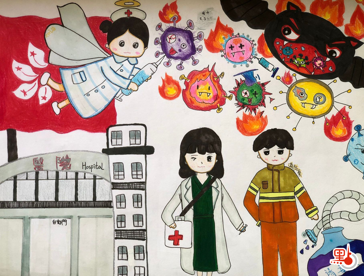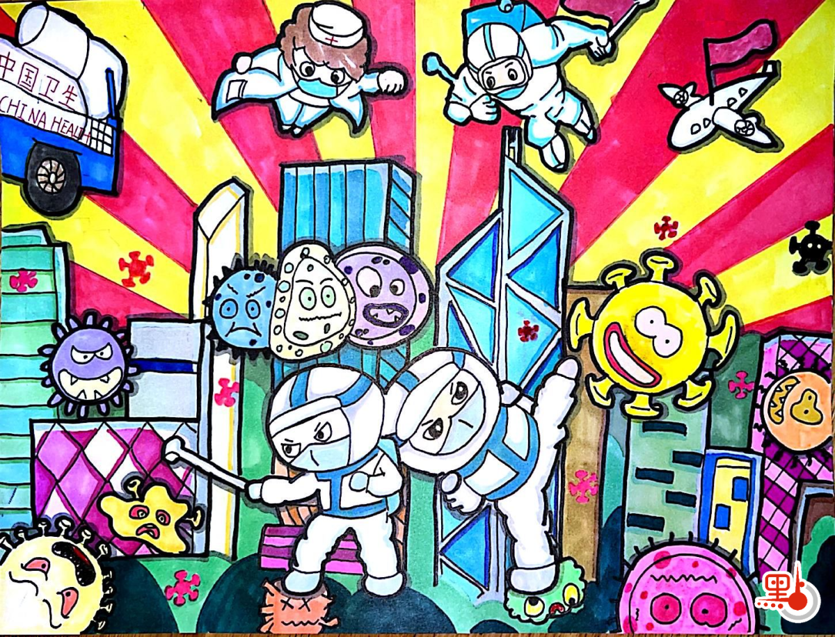 我畫這幅畫是多謝醫護人員消滅病毒,也特別多謝來自內地的專家及救援人員,他們不辭勞苦地救人,我希望病毒快點被消滅,大家快點恢復正常的生活。