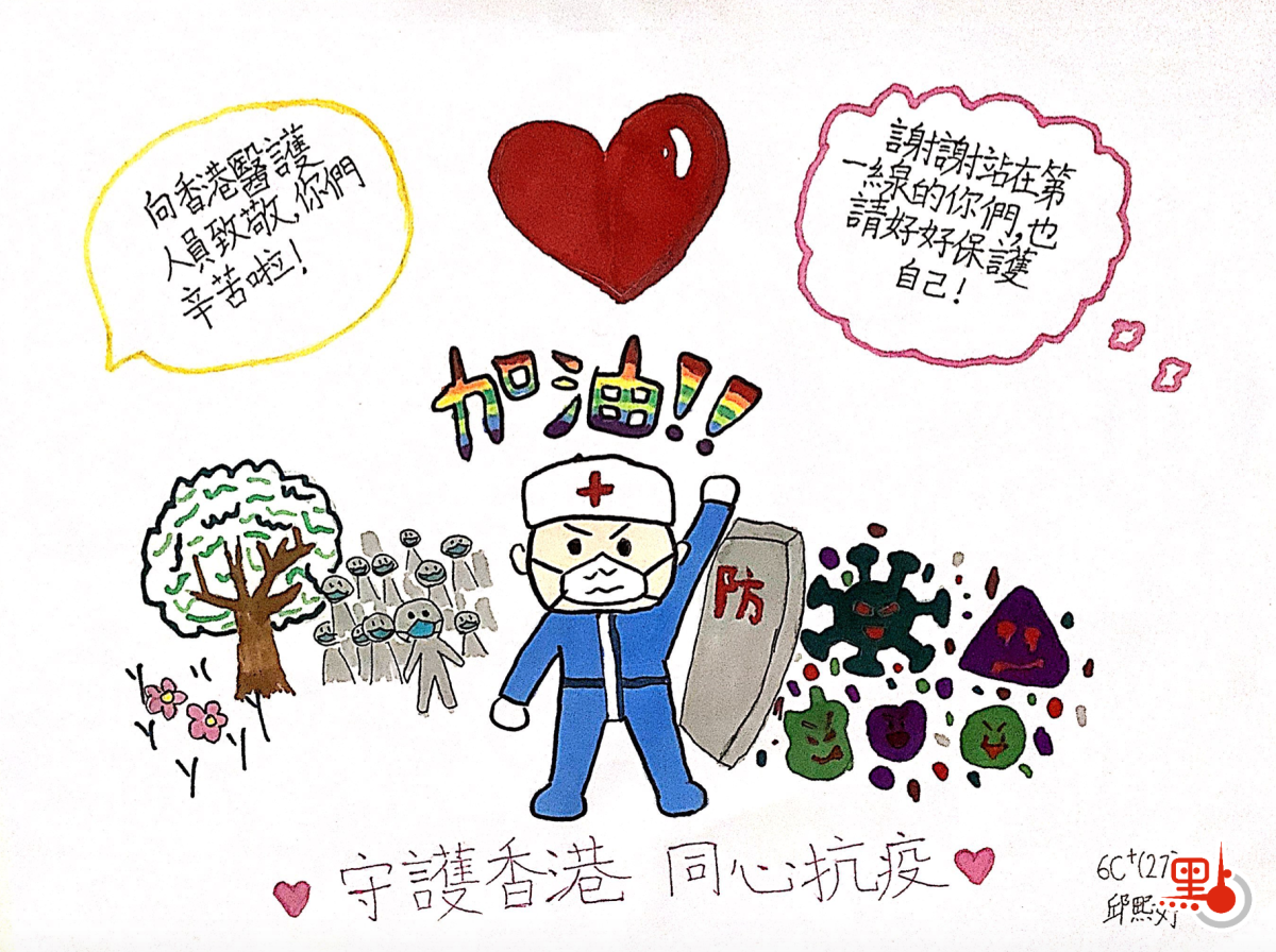 編者按:香港疫情持續嚴峻,現時醫護人員、紀律部隊、義工、內地支援人員等前線抗疫工作者傾盡全力抗擊疫情,學生雖然未能走上抗疫前線,亦都希望向疫情一線的英雄們送上真摯祝福及敬意,並為香港抗疫加油打氣。點新聞近期組織香港多所中小學,鼓勵學生以信件、視頻、繪畫的方式向一線抗疫工作者表達感謝。意存筆先,以畫表意,快來看看香港學生們的創作!