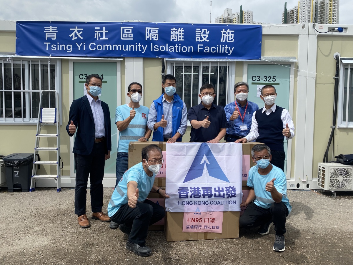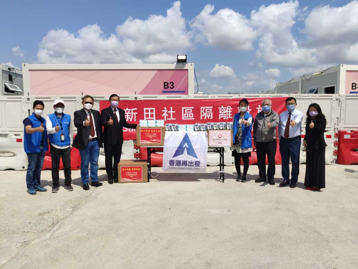 在中央的全力支援下,青衣、新田、粉嶺、潭尾、洪水橋、甚至在港珠澳大橋口岸人工島等多個隔離設施(方艙醫院),很短的時間內陸續落成並交付使用。香港再出發大聯盟向這些設施的前線員工贈送了防疫物資,包括有 KN95 口罩、酒精搓手液及一些抗疫藥物等。
