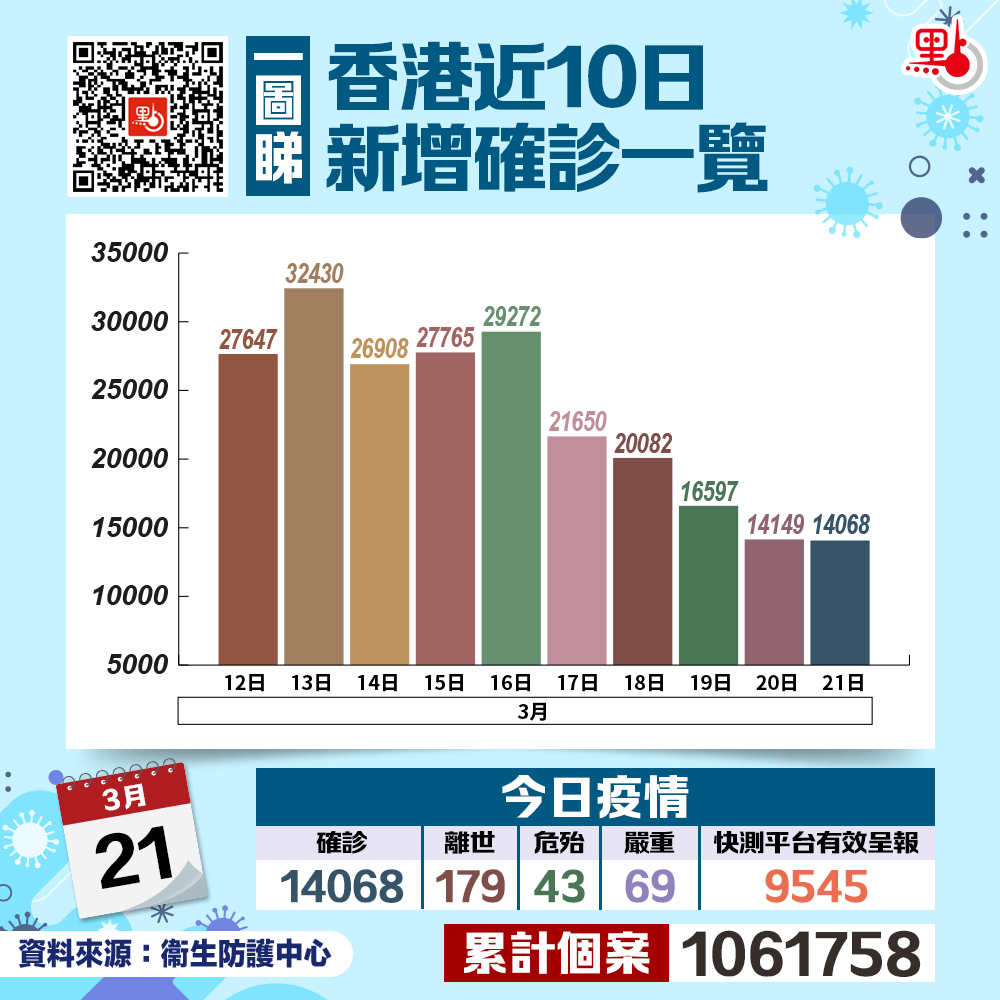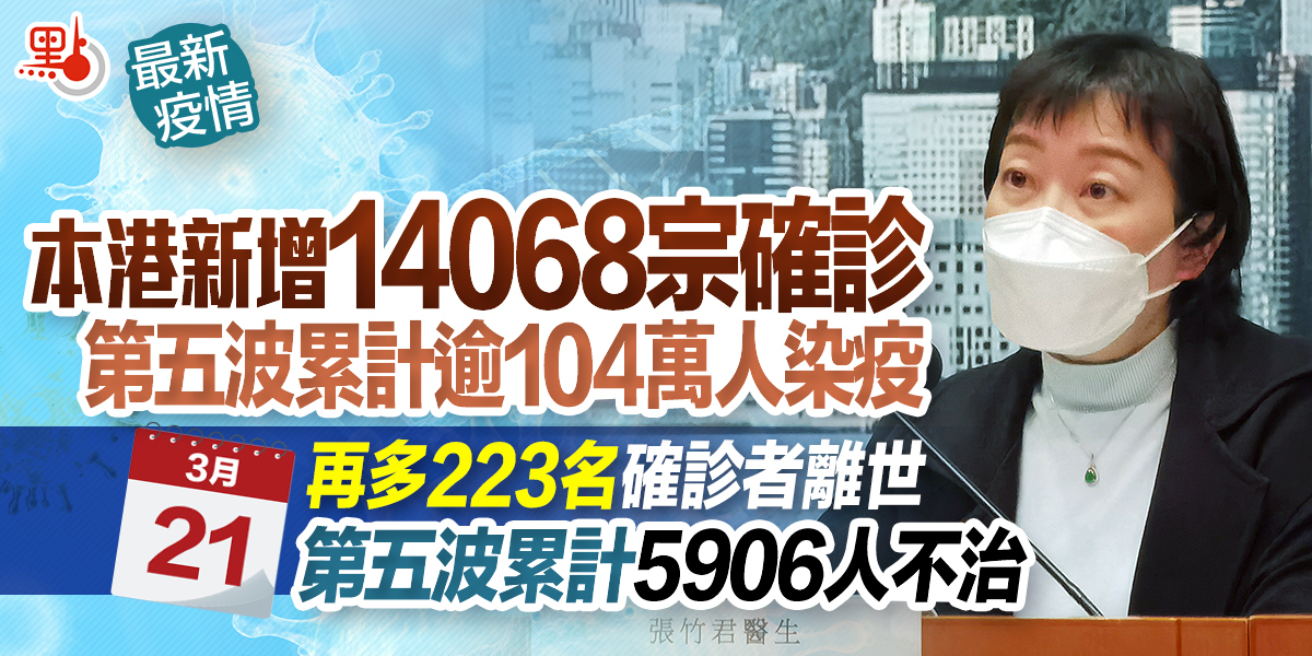 本港第五波疫情嚴峻,衞生署及醫管局今日(21日)下午舉行疫情記者會。衞生署衞生防護中心傳染病處主任張竹君公布,截至今日零時,本港新增14068宗確診個案,當中4523宗經核酸檢測確診,其中5宗為輸入個案;餘下9545宗為快速抗原測試呈報有效個案。